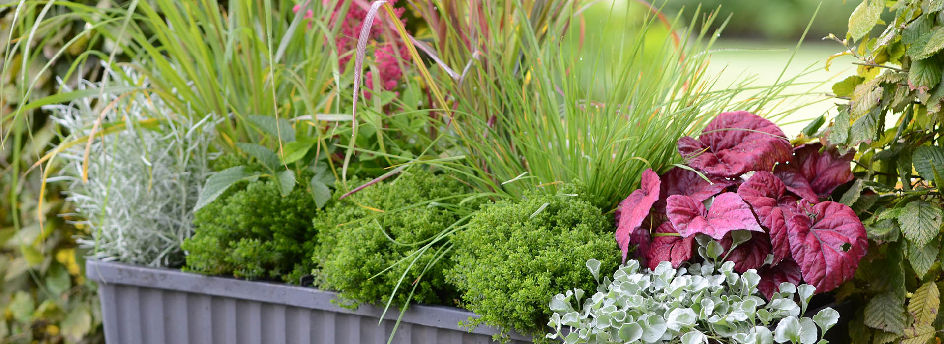 Curryeternell, Prydnadsgräs, Hebe, Silvernjurvinda och Bladbegonia