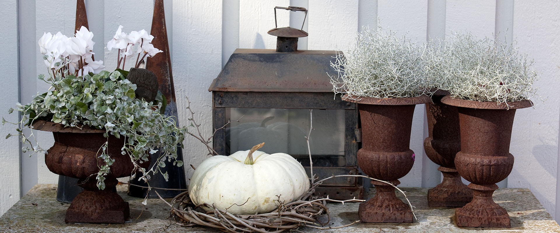 Vitblommande Cyklamen och Silvernjurvinda samsas i en urna medan Silvergirland får stoltsera solitärt.