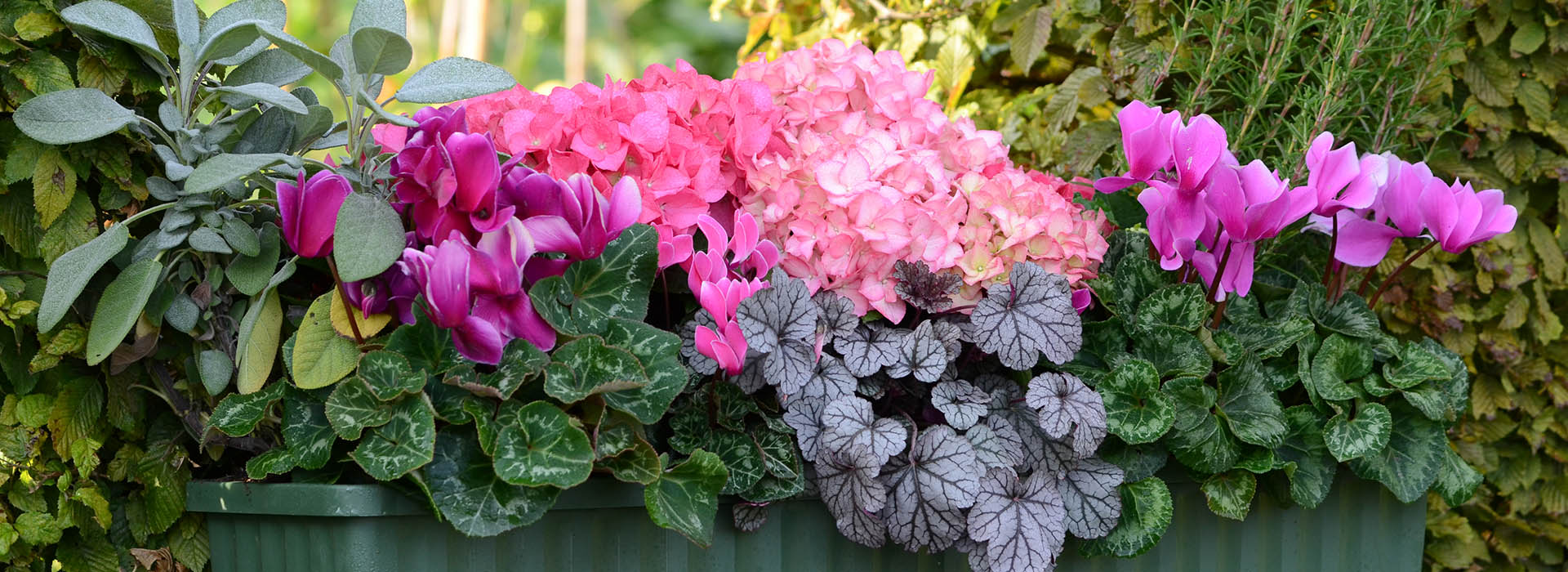 Kryddsalvia, Cyklamen, Hortensia, Heuchera, Cyklamen x2
