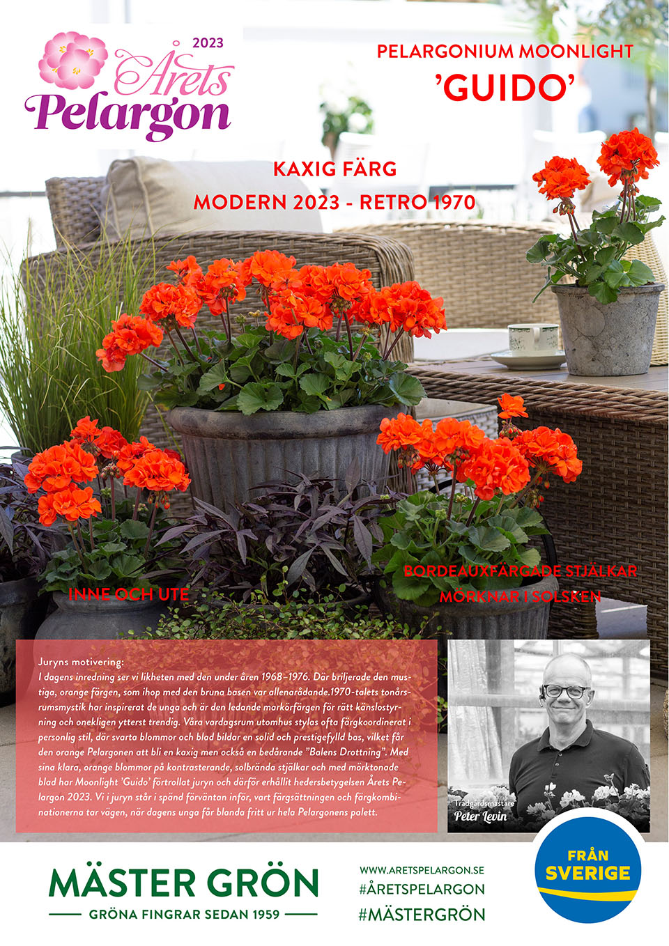"I dagens inredning ser vi likheten med den under åren 1968–1976. Där briljerade den mustiga, orange färgen, som ihop med den bruna basen var allenarådande.1970-talets tonårsrumsmystik har inspirerat de unga och är den ledande markörfärgen för rätt känslostyrning och onekligen ytterst trendig. Våra vardagsrum utomhus stylas ofta färgkoordinerat i personlig stil, där svarta blommor och blad bildar en solid och prestigefylld bas, vilket får den orange Pelargonen att bli en kaxig men också en bedårande ”Balens Drottning”. Med sina klara, orange blommor på kontrasterande, solbrända stjälkar och med mörktonade blad har Moonlight ’Guido’ förtrollat juryn och därför erhållit hedersbetygelsen Årets Pelargon 2023.