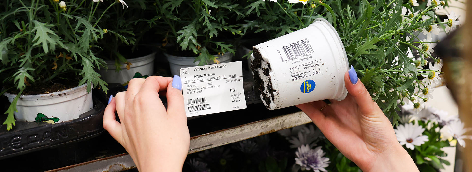 I odling så märks de brätten som packas till kund med en distributionsetikett. Denna innehåller mycket värdefull information om godset, mängder och till vilken destination som det skall transporteras. Här kontrolleras informationen med den som finns applicerad på krukan. Här ser du också ett växtpass, en information som var del av värdekedjan utfärda. Ett växtpass står som garant för att produkten är frisk och ren från eventuella smittor. skall