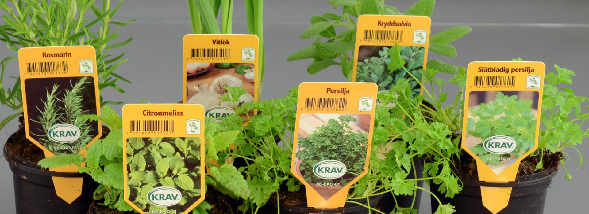 Plastetiketter som appliceras utan jordkontakt fasas ut till fördel för hårdpressad träfiber. För etiketter som sticks ner i krukan och får jordkontakt inväntar vi producenternas lösningar. innan vi kan fasa ut plasten.