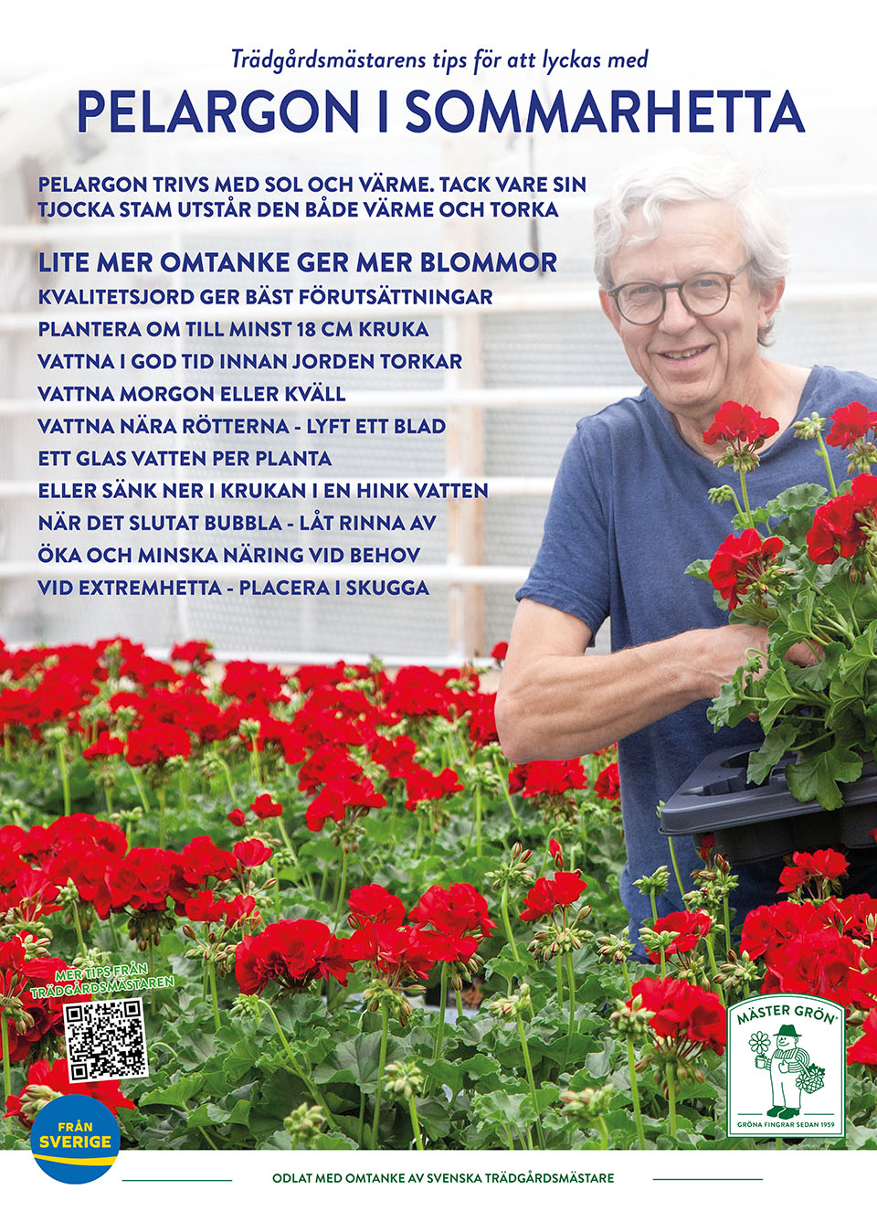Vattna gärna på morgonen eller på kvällen när värmetrycket är lägre och Pelargonen kan ta nytta av både vatten och näring.