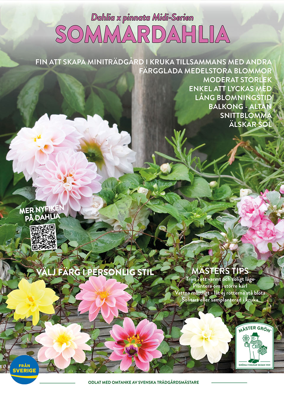 För dig som arrangerar Miniträdgård i kruka är Dahlia Midi en perfekt växt att jobba med. En högst moderat tillväxt och riklig blomning, så blir den ett färgstarkt inslag tillsammans med andra sommarblommor.