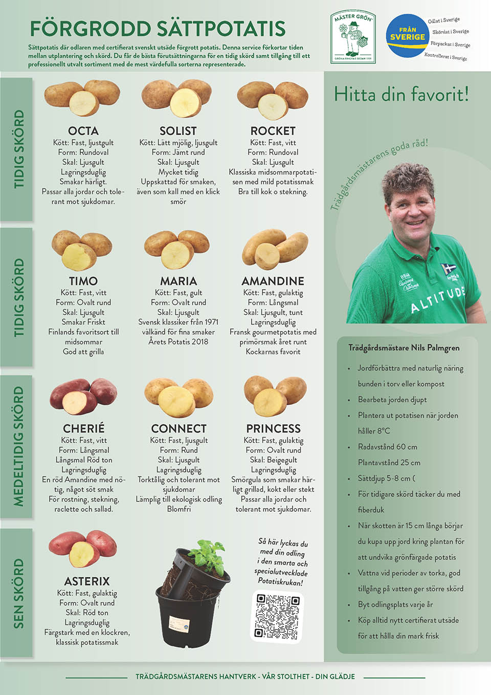 Ett väl utvalt sortiment med både klassiska sorter men också en del nya moderna där smak och kvalitet ligger i fokus. Alla sorter odlas hos Palmgrens Krukväxter i en smart 6-Pack.