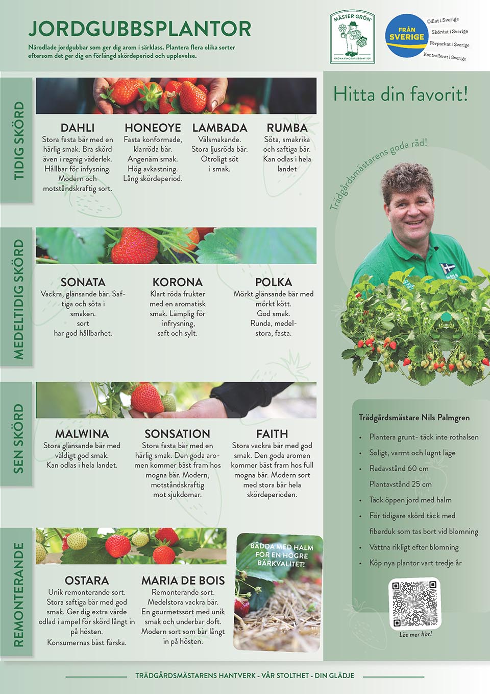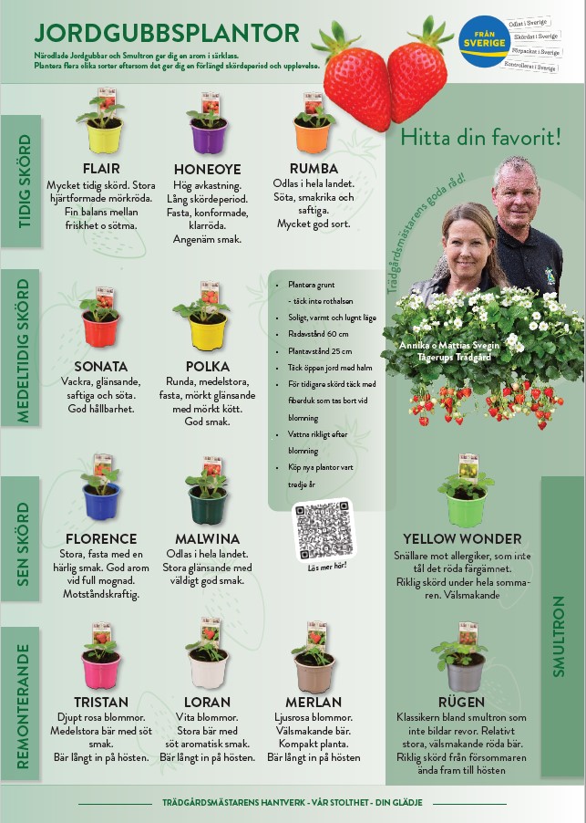 Ett väl utvalt sortiment med både klassiska sorter men också en del nya moderna där smak och längre skördeperiod ligger i fokus. Alla sorter odlas hos Palmgrens Krukväxter i en smart 6-Pack.